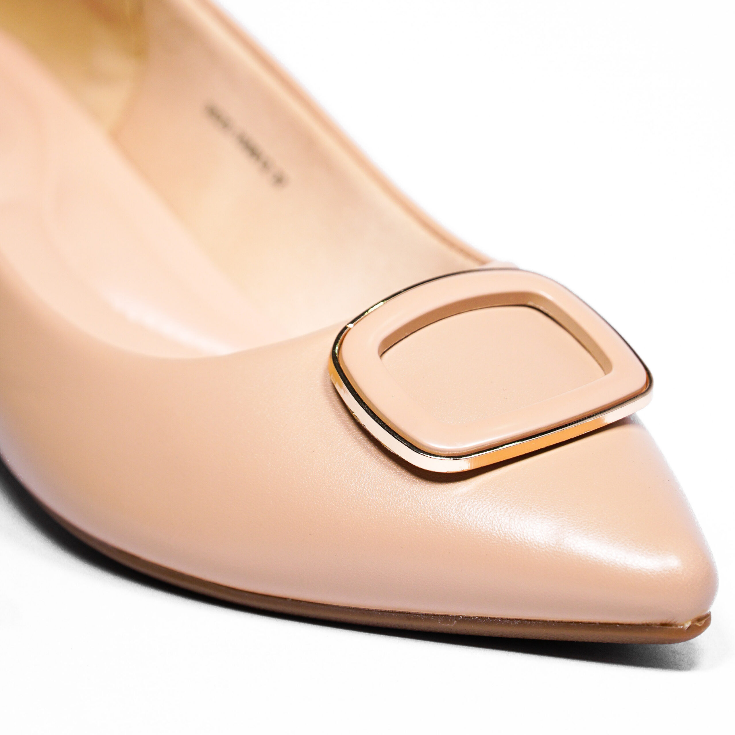 These pointed-toe pumps feature a sleek 2.5 cm block heel for subtle height and easy comfort. Designed with a shaped buckle accent and soft lining, they offer a polished, stylish look perfect for everyday wear.